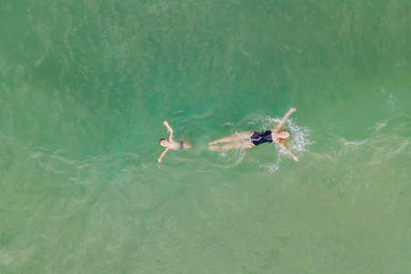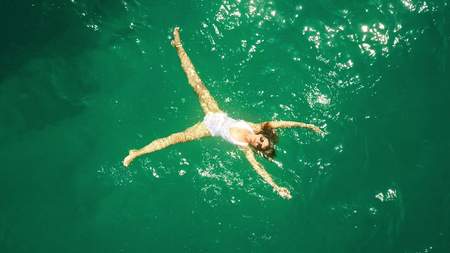 Aerial top down view of a beautiful young woman in a white swimsuit bathing in the sea