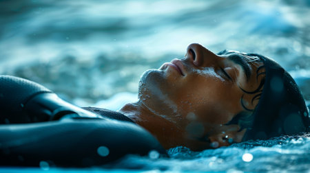 A person is carefully treading water in a frozen lake their body slowly adapting to the numbing sensation