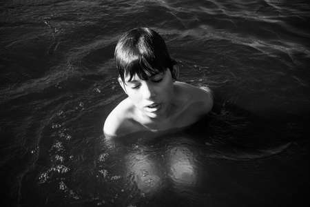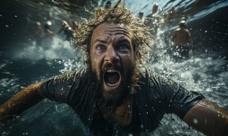 A man in the water with his mouth open, showcasing an action of surprise or shock.