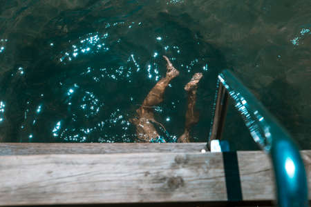 Leisure, relax and active lifestyle concept. Underwater girl wearing bikini swimming and diving