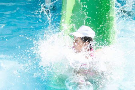Young girl diving backwards into water with splashes under the supervision of her mother. She is enjoying a safe summer swim while her mother ensures her safety and care