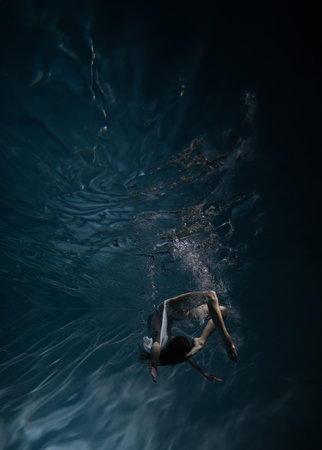 A surreal portrait of a young blonde girl swimming underwater in a pool in a black dress, arms outstretched like a bird. Shooting from the bottom of the pool in the contour light of the sun.