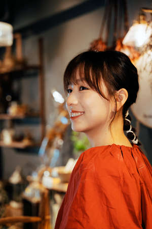 Portrait of a beautiful Asian woman in black shirt on dark background