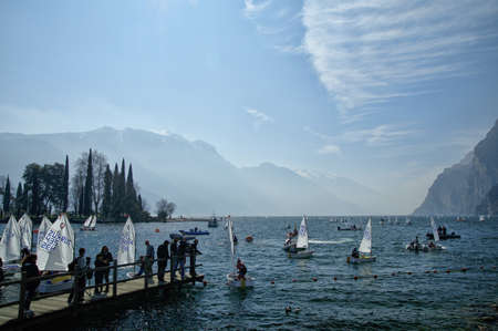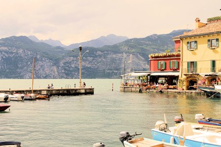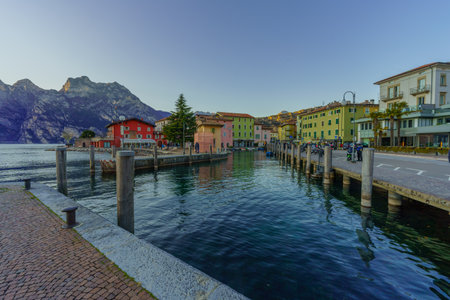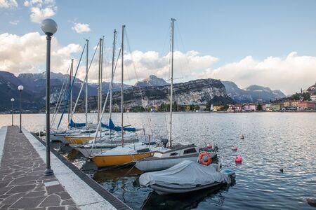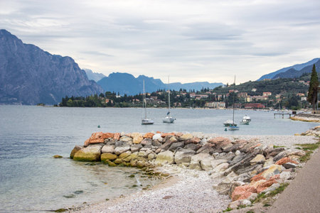 Torbole, Italy - August 2, 2015: Lake Garda boardwalk with tourists and boats in Torbole, Italy. Torbole is one of the most popular towns on Garda Lake, known as a wind surfers paradise.