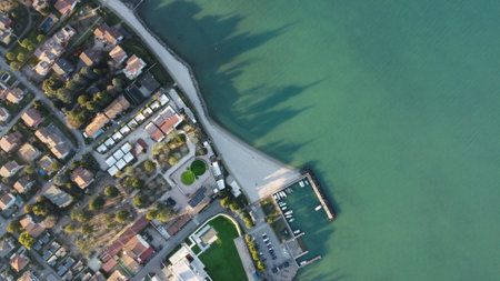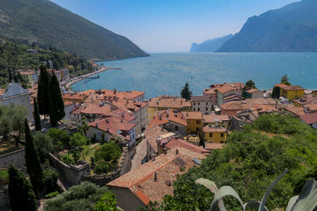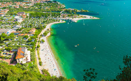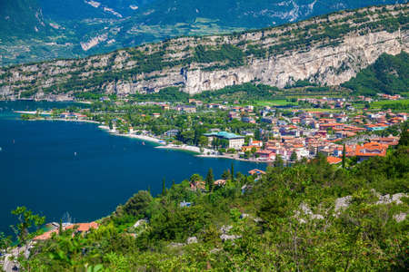 Aerial view at the popular touristic villages Linfano and Torbole at northern lake Garda, Italy. on a beautiful summer day. Blue water, rocks, mountains, sunlight and clear sky.