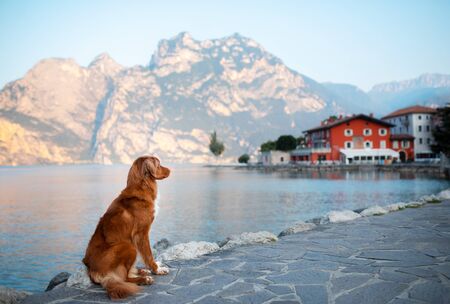 travel with a pet.red Dog on the promenade in Italy. Nova Scotia Duck Tolling Retriever posing by the lake