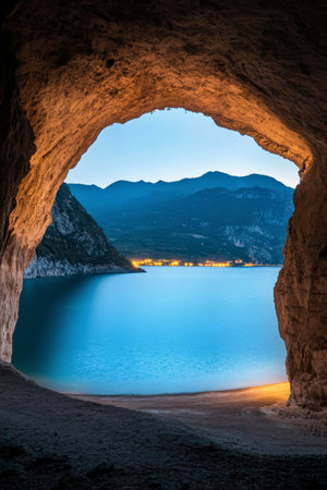 A breathtaking view from within a cave reveals a calm blue lake surrounded by rugged mountains during twilight, creating a peaceful atmosphere as daylight fades away.