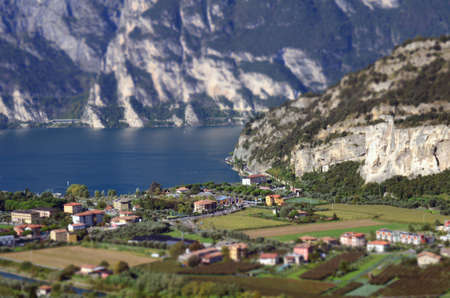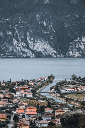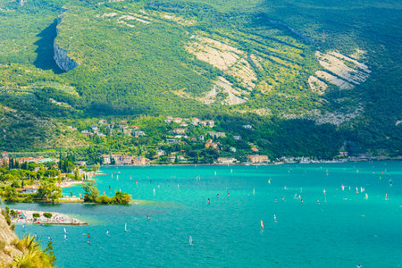 Top view of Lake Lago di Garda and the village of Torbole, alpine scenery. Italy.