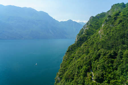 beautiful view of Lake Garda from the Ponale road, with the blue sky, sailing boats, and the green of the lush mountains of Trentino Alto Adige
