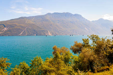 Windsurfers on Lake Garda at the Northern end where the wind is constant in Italy