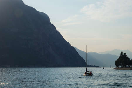 Lake Como in the Italian city of Lecco surrounded by mountains. A sailing yacht. Evening sunshine.