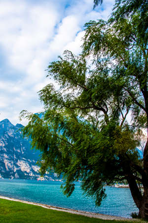 green tree on the pebble beach of Lake Garda in Riva del Garda, Trento, Italy