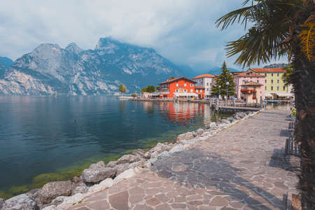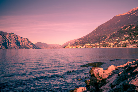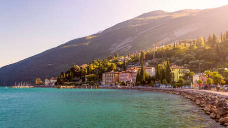 Beautiful evening scenery on the beach with cute little village, lago di garda, Italy.