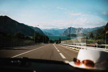 Scenic route on Lake Garda and beautiful village Limone sul Garda, Italy. Travel background