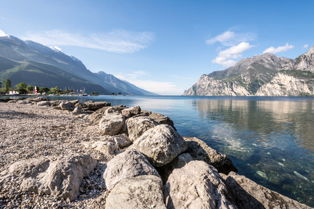 Nature wilderness landscape at lake Garda, Italy on a beautiful summer day. Blue water, rocks, mountains, sunlight and clear sky.
