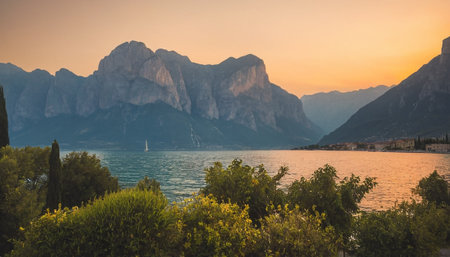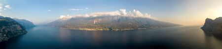 Sunset on Lake Garda in Italy. Panoramic view of the lake and mountains.
