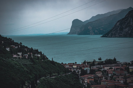 Idyllic coastline scenery in Italy, captured from the water. Blue water and a cute village at lago di garda, Limone