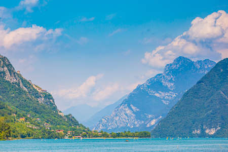 Beautiful view over lake Idro Italy. Houses, small village on the foreground and blue water and mountains in the background.
