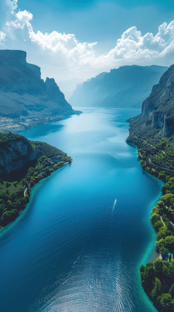 A single boat traverses a narrow, winding lake surrounded by towering, verdant mountains on a bright, sunny day. The water is a vibrant blue, contrasting with the deep green foliage and the clear blue sky dotted with fluffy white clouds.