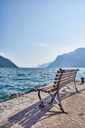 Deserted shore of Lake Garda in Italy in the absence of tourism at dawn in a contemporary style.