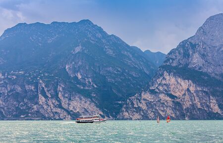 Nago Torbole, Lago di Garda (Lago Benaco), Italy - June 18, 2019. A tourist boat on Lake Garda in Torbole resort.