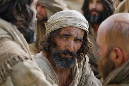 Emotional man gazes upwards with intensity, surrounded by a crowd, capturing a moment of reflection and drama in a historical setting filled with tension and atmosphere
