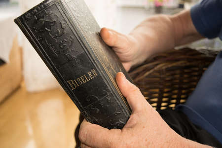 Close up of hand holding holy bible book. Concept of faith, spirituality and religion.