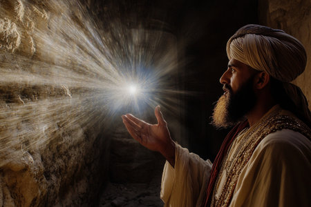 Jesus appears to his followers in the rays of light. Biblical scene in the fog. Digital painting. Noir et blanc.