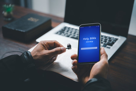 Christian online technology concept. Hands praying of christian with digital computer laptop, Online live church for sunday service. Asian catholic man are reading Holy bible book and online study.