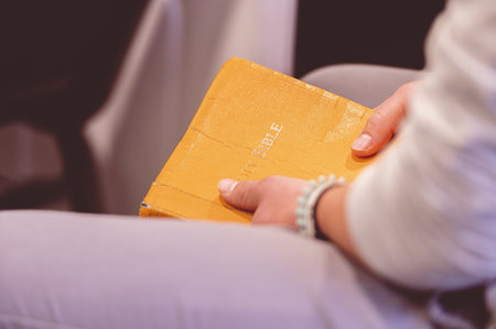 Female hands holding a closed Bible book with yellow cover