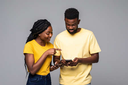 Positive african-american couple managers showing little size of prices with fingers on white studio background