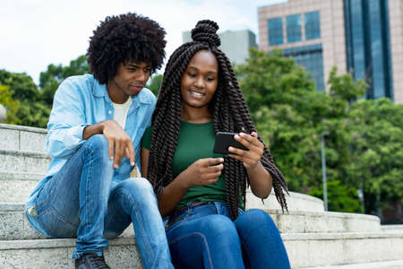 Young african american male and female influencer posting message with mobile phone outdoor in city in summer