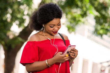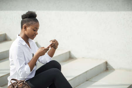 Beautiful elegant african american internet blogger female holding smart phone while sitting on white stairs in the city. Business, travel and technology lifestyle.