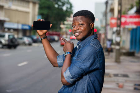 young african man standing in the street in jeans shirt looking at the camera smiling with closed fist.