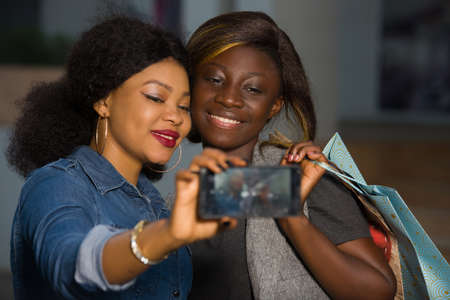 Four african friends having fun outdoors. Two black girls with guys with mobile phones make selfie.