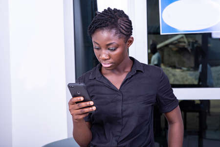 beautiful young african couple sitting together on sofa at home, woman using mobile phone.