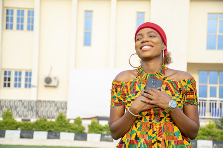 Portrait of happy young african man in cloth loincloth looking at the screen of his phone outdoors. Man with a beard makes a gesture while fixing the phone which is in his hands and expresses his joy by making a gesture with the handle