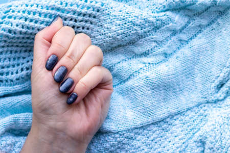 Female hand with beautiful manicure - dark blue glittered nails on blue knitted sweater fabric background. Selective focus. Closeup view with copy space