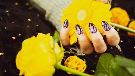 Adult womans hand in stylish knitted glove with purple manicure on black background. Crop unrecognizable person with design on nails. Concept of care and beauty.