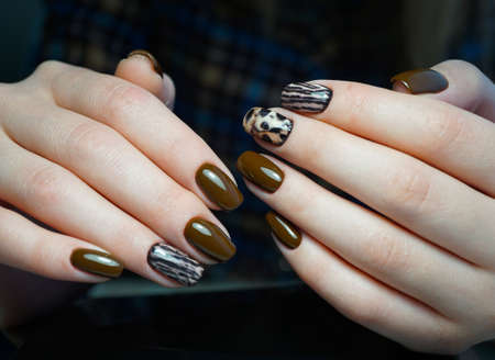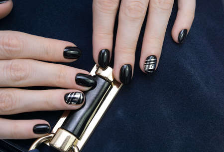 Stylish and strict female manicure with a black French design. Female camouflage manicure with black design and rhinestone.