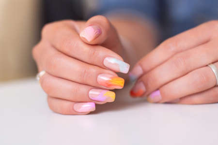 Beautiful female hands with multicolored manicure nails, pink, blue and orange gel polish