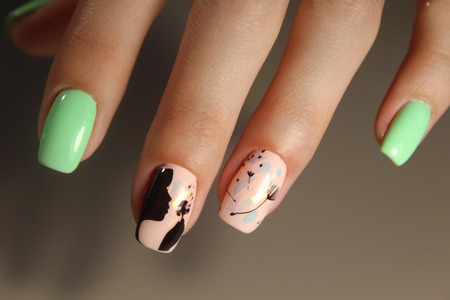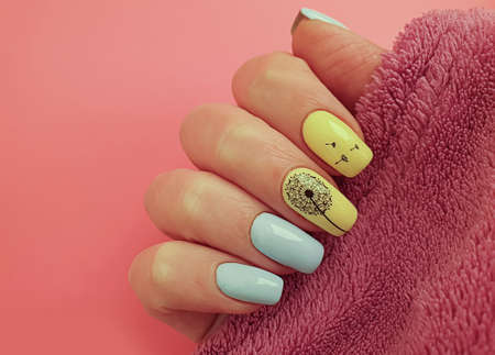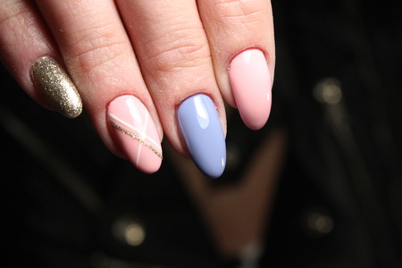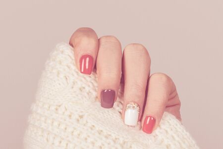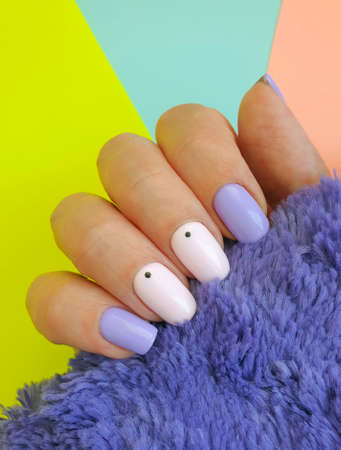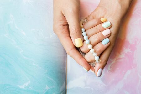Beautiful colored pastel colors nail polish on hand, closeup. Nail art manicure concept