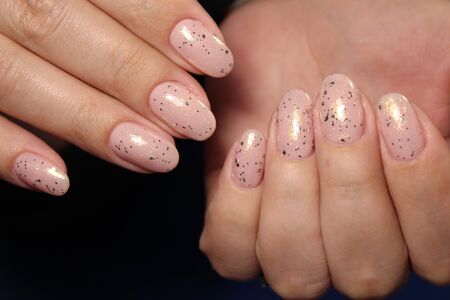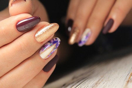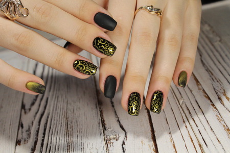 Female hand with trendy manicure. Nail design on a gold background closeup