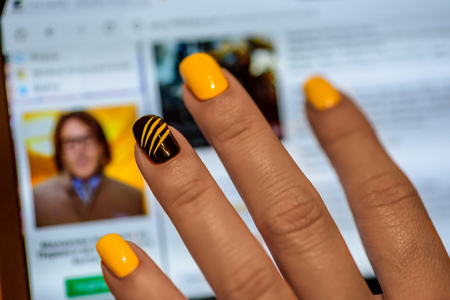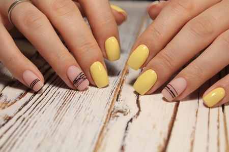 Female hand with yellow nail design. Long nail polish manicure. woman hand on yellow paper background