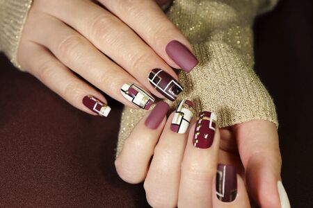 Burgundy and white design on long nails with Golden lines. Fashionable matte glossy nail art.