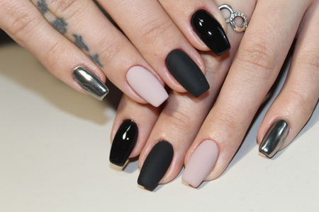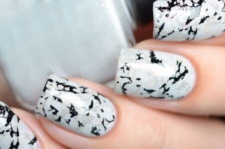 Closeup of woman hands with nail design. Trendy crackle nail polish. Manicure and nail tattoo trend. Closeup of woman hands on black background. Fashion Stylish Fashion Colorful Nails.