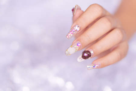 Close up fashionista woman acrylic fingernail painting beautiful white color gel nail art decorated with cute 3D rose flower sparkling rhinestone sweet design for valentine day