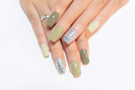 close up woman fingernail square shape painting beautiful shiny green color gel polish with sparking silver gliitter on ringfinger isolated on white background