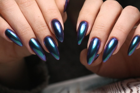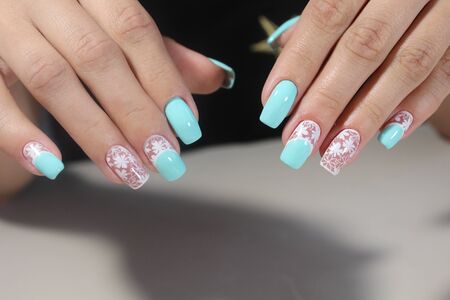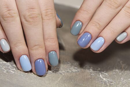 Stylish blue female nails. Modern trendy stylish Beautiful manicure. Autumn winter nail minimalistic design concept of beauty treatment. Gel nails. Skin care. Copy space for text. Beautician advertisement. Wellness. Trendy colors.