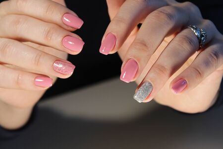 Womans hands with silver jewelry and accessories. Girl with minimal pink spring summer manicure design. Fashion beauty concept